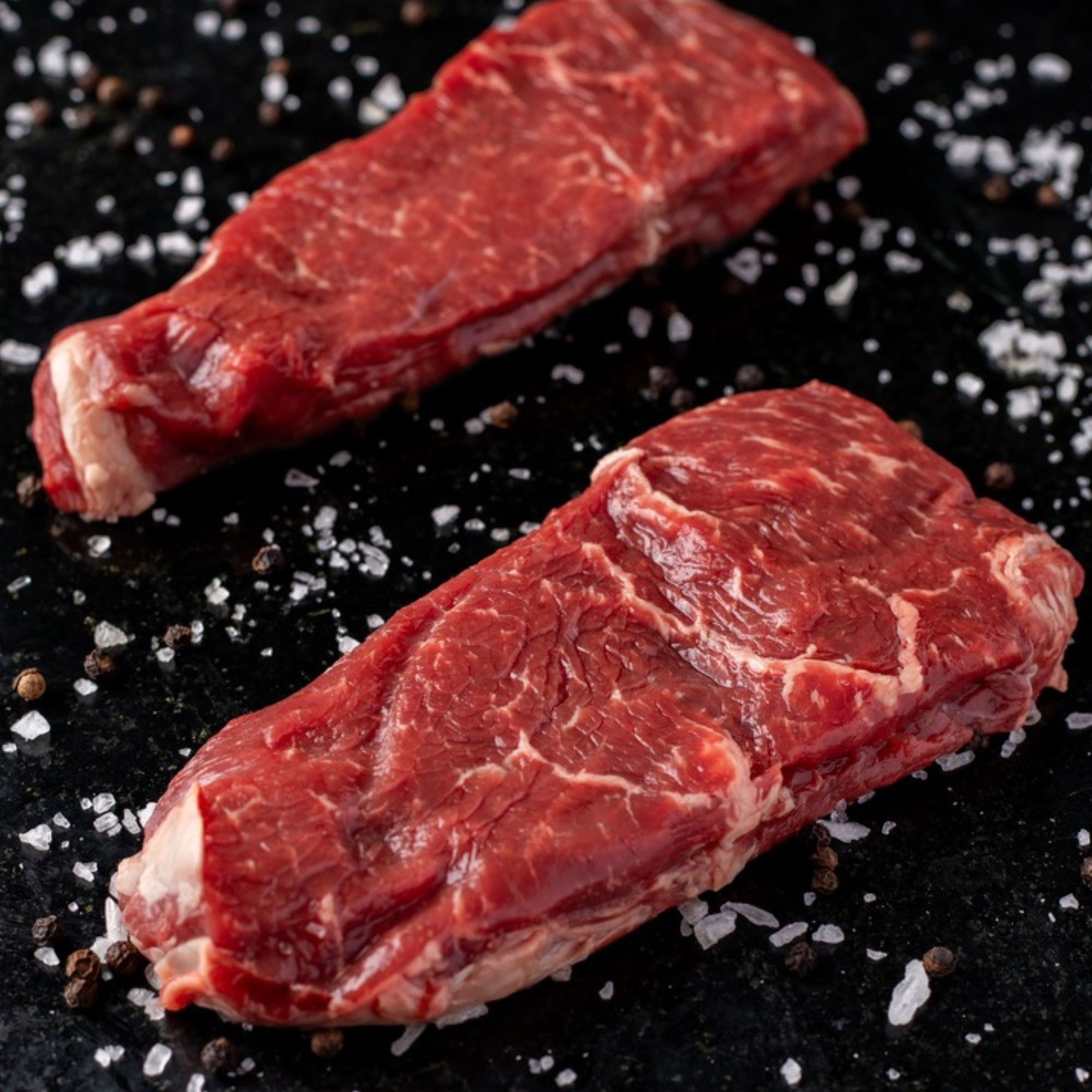 Our grass-finished and dry aged New York steaks are cut 1" thick and oh so tasty! New York steaks are packaged two per package and all steaks are packaged by our local USDA butcher, vacuum sealed and frozen solid.*